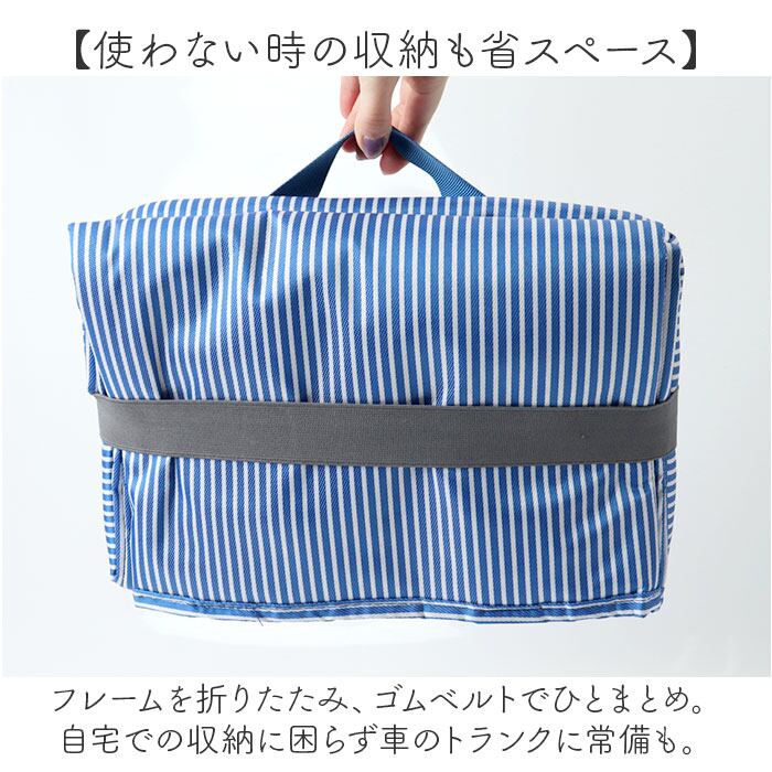 ・フレームを折りたたみ、ゴムベルトでひとまとめ。自宅での収納に困らず車のトランクに常備も。