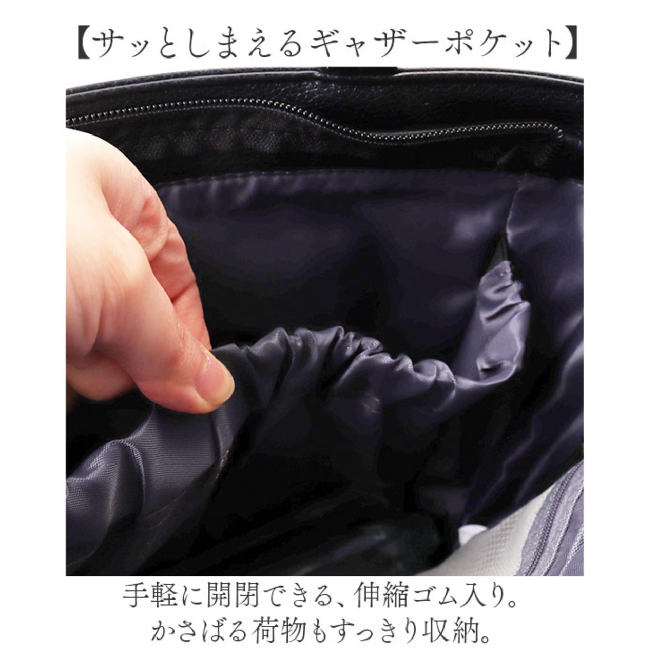 ・手軽に開閉できる、伸縮ゴム入り。かさばる荷物もすっきり収納。
