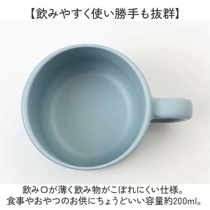 ・飲み口が薄く飲み物がこぼれにくい仕様。食事やおやつのお供にちょうどいい容量約200ml。