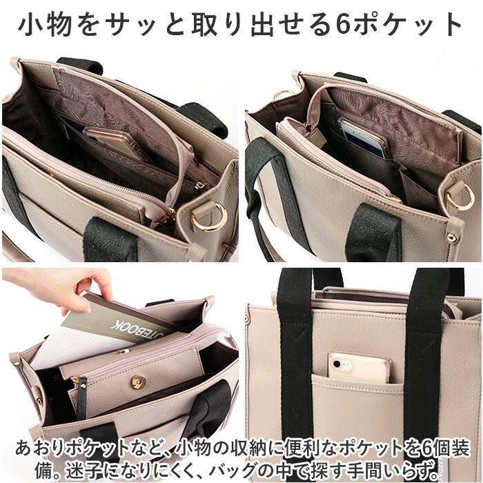 ・あおりポケットなど、小物の収納に便利なポケットを6個装備。迷子になりにくく、バッグの中で探す手間いらず。