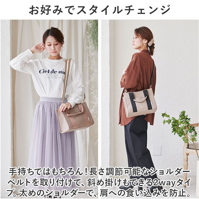 ・手持ちではもちろん!長さ調節可能なショルダーベルトを取り付けて、斜め掛けもできる2wayタイプ。太めのショルダーで、肩への食い込みを防止。