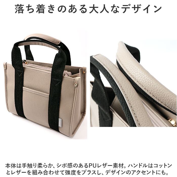 ・本体は手触り柔らか、シボ感のあるPUレザー素材。ハンドルはコットンとレザーを組み合わせて強度をプラスし、デザインのアクセントにも。