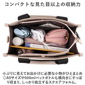 ・小ぶりに見えてお出かけに必要な小物がひとまとめ◎A5サイズや500mlペットボトルも横向きにすっぽり収まり、しっかり自立するスクエアフォルム。