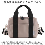 ・本体は手触り柔らか、シボ感のあるPUレザー素材。ハンドルはコットンとレザーを組み合わせて強度をプラスし、デザインのアクセントにも。