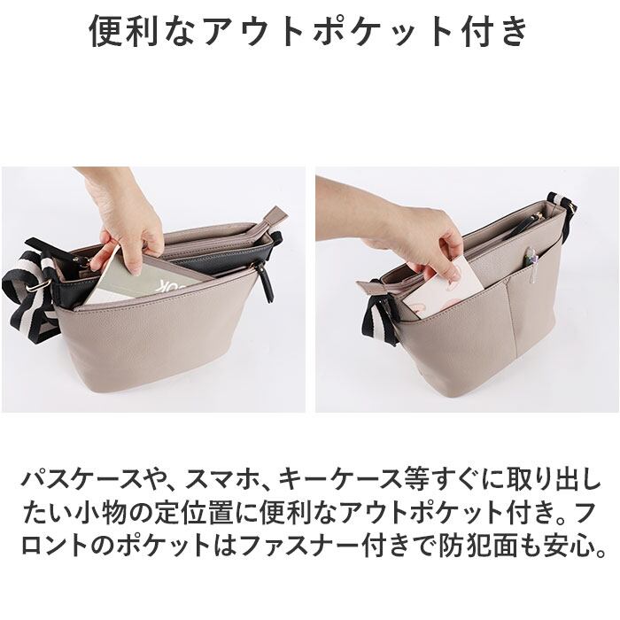 ・パスケースや、スマホ、キーケース等すぐに取り出したい小物の定位置に便利なアウトポケット付き。