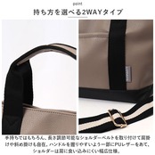 ・手持ちではもちろん、長さ調節可能なショルダーベルトを取り付けて肩掛けや斜め掛けも自在。ハンドルを握りやすいよう一部にPUレザーをあて、ショルダーは肩に食い込みにくい幅広仕様。