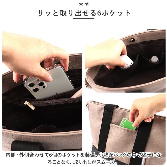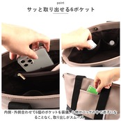 ・内側・外側合わせて6個のポケットを装備。小物がバッグの中で迷子になることなく、取り出しがスムーズ。