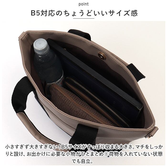 ・小さすぎず大きすぎない!B5サイズがすっぽり収まる大きさ。マチをしっかりと設け、お出かけに必要な小物がひとまとめ◎荷物を入れていない状態でも自立。