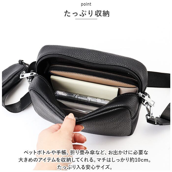 ・ペットボトルや手帳、折り畳み傘など、お出かけに必要な大きめのアイテムを収納してくれる。マチはしっかり約10cm。たっぷり入る安心サイズ。