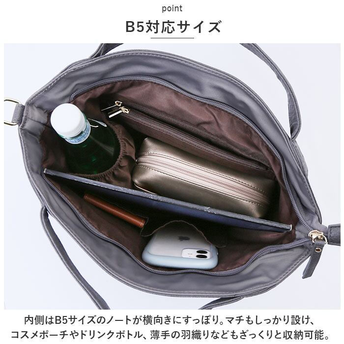 ・内側はB5サイズのノートが横向きにすっぽり。マチもしっかり設け、コスメポーチやドリンクボトル、薄手の羽織りなどもざっくりと収納可能。