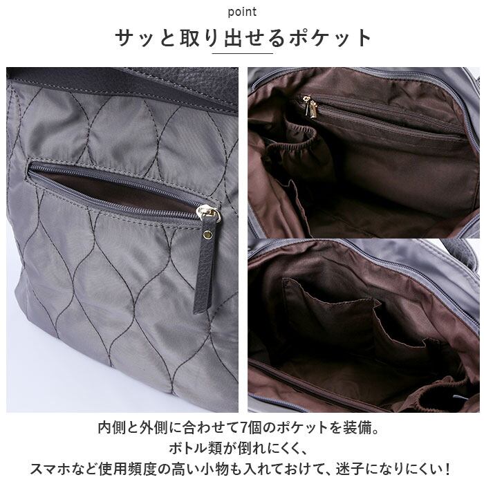 ・内側と外側に合わせて7個のポケットを装備。ボトル類が倒れにくく、スマホなど使用頻度の高い小物も入れておけて、迷子になりにくい!