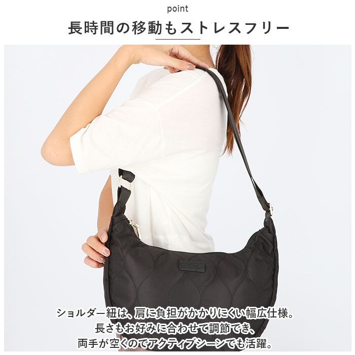 ・ショルダー紐は、肩に負担がかかりにくい幅広仕様。長さもお好みに合わせて調節でき、両手が空くのでアクティブシーンでも活躍。