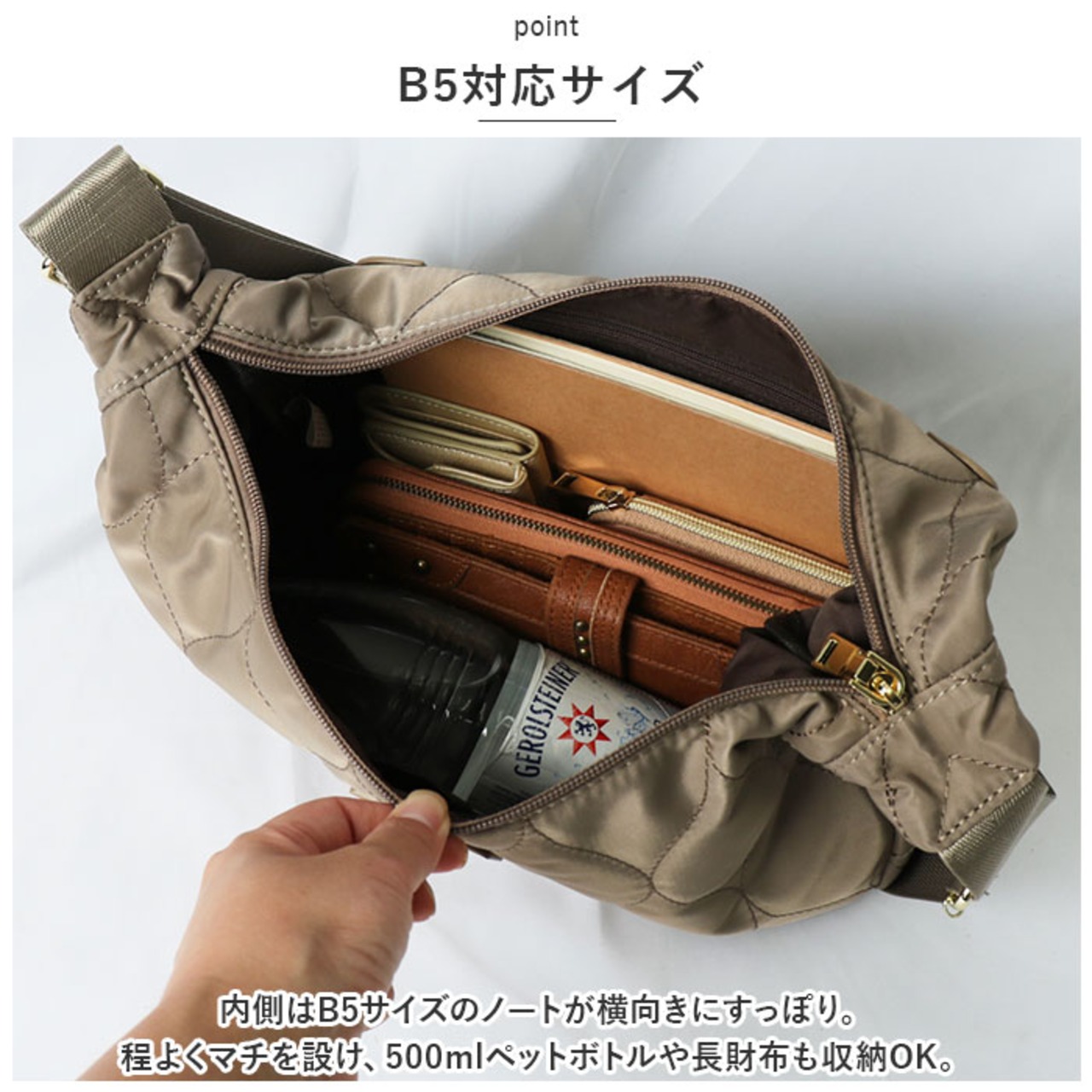 ・内側はB5サイズのノートが横向きにすっぽり。程よくマチを設け、500mlペットボトルや長財布も収納OK。