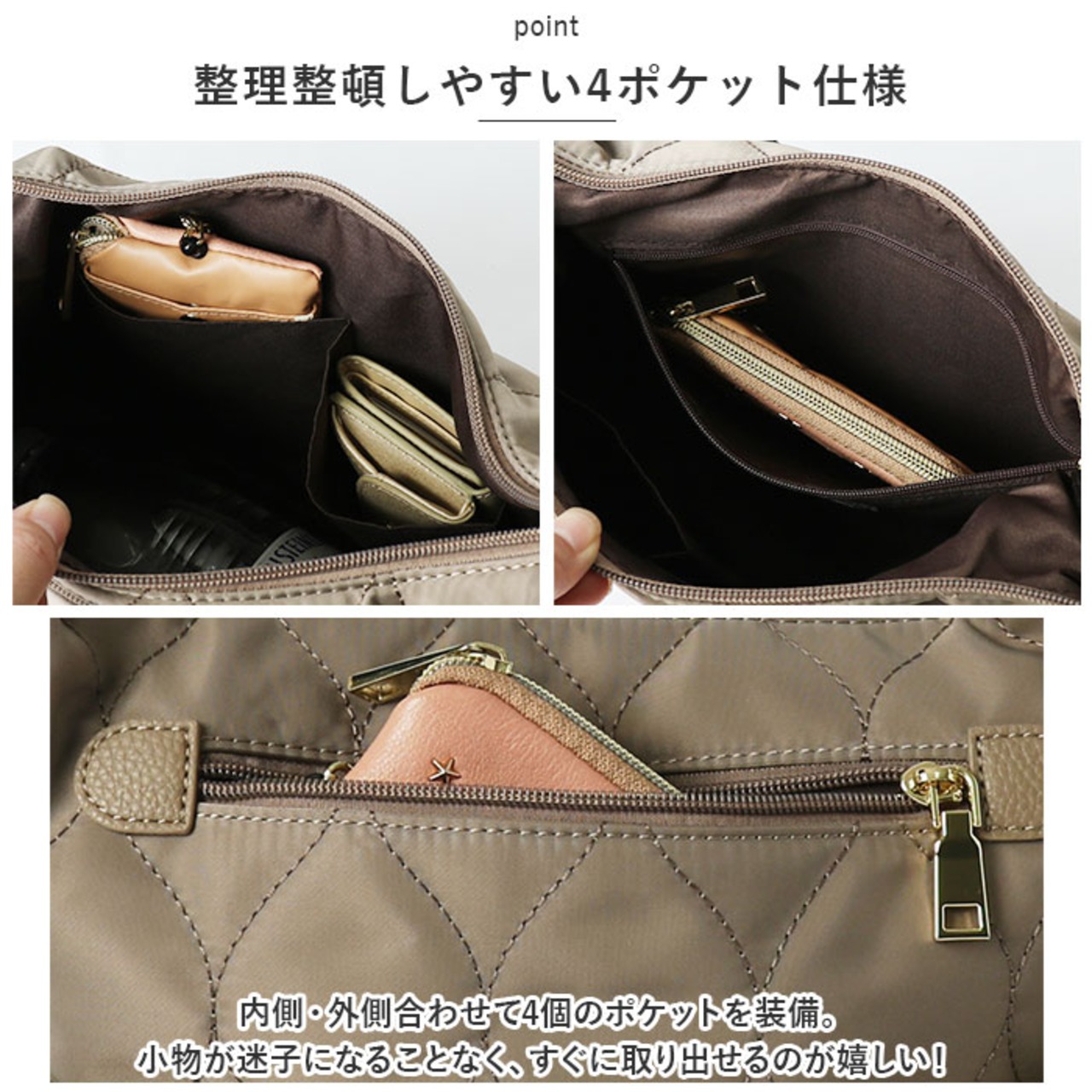 ・内側・外側合わせて4個のポケットを装備。小物が迷子になることなく、すぐに取り出せるのが嬉しい!