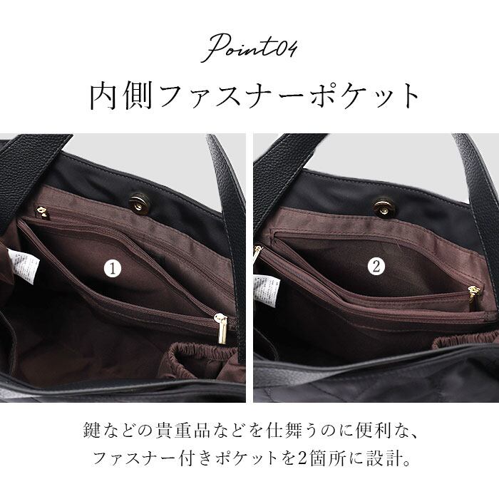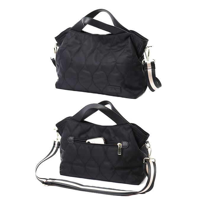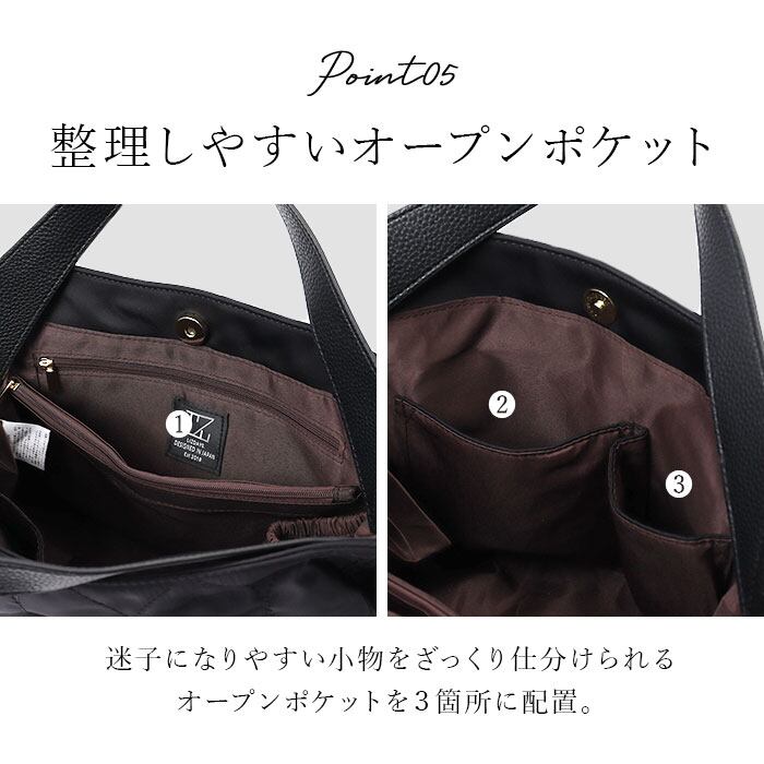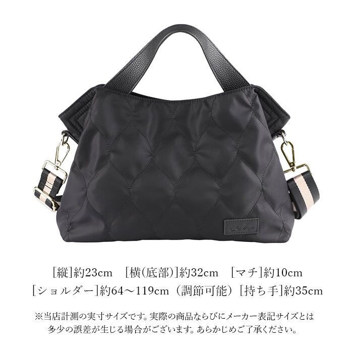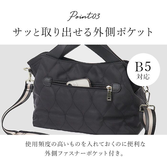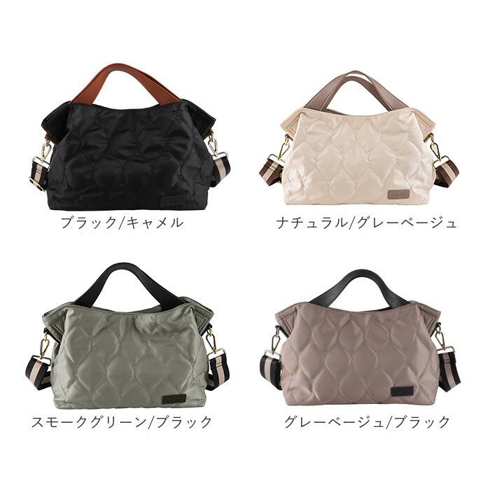 ・表面全体に施された、丸みのあるキルティングデザインが印象的☆PUレザーのハンドルや上品な光沢のあるショルダーを取り入れ、カジュアルにもキレイめにもマッチ!