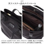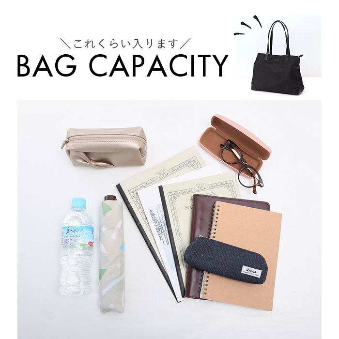 ・メインルームは天ファスナー式で、プライバシーを確保。程よくマチを設け、長財布やコスメポーチ、500mlペットボトル、お弁当箱などを収納可能。