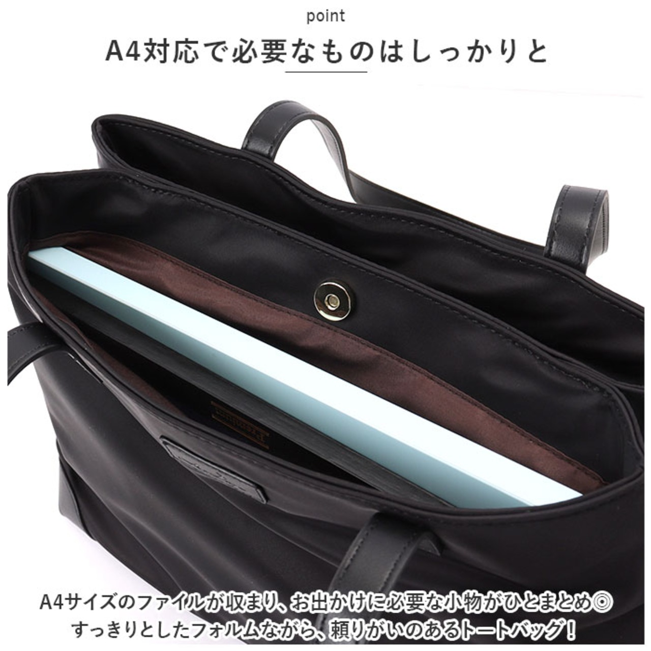 ・A4サイズのファイルが収まり、お出かけに必要な小物がひとまとめ◎すっきりとしたフォルムながら、頼りがいのあるトートバッグ!
