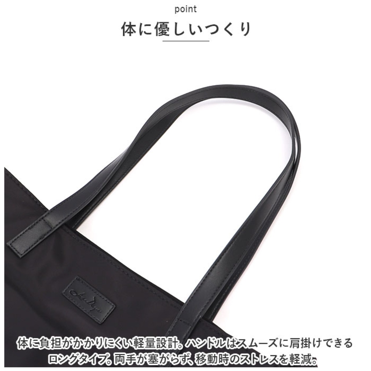 ・体に負担がかかりにくい軽量設計。ハンドルはスムーズに肩掛けできるロングタイプ。両手が塞がらず、移動時のストレスを軽減。