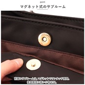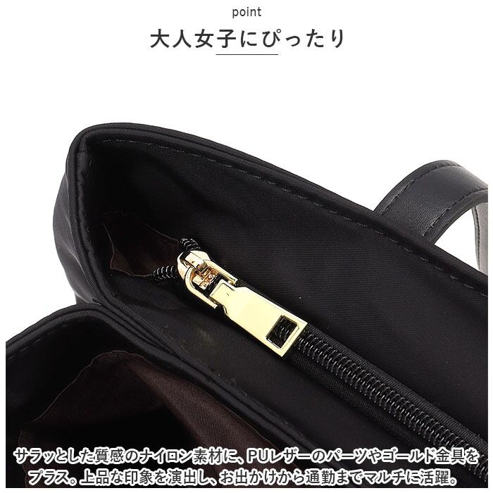 ・サラッとした質感のナイロン素材に、PUレザーのパーツやゴールド金具をプラス。上品な印象を演出し、お出かけから通勤までマルチに活躍。