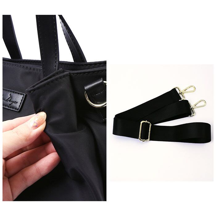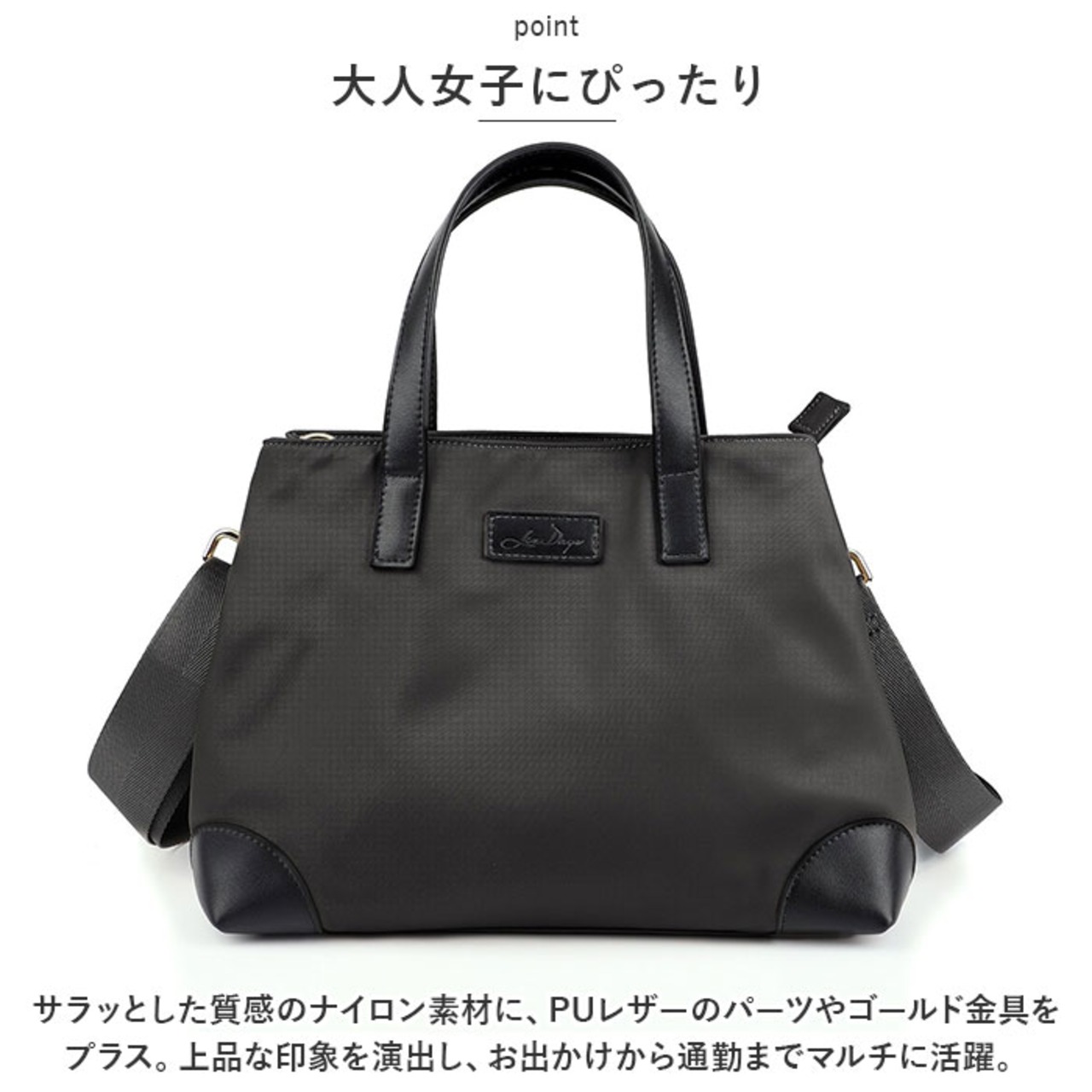 ・サラッとした質感のナイロン素材に、PUレザーのパーツやゴールド金具をプラス。上品な印象を演出し、お出かけから通勤までマルチに活躍。