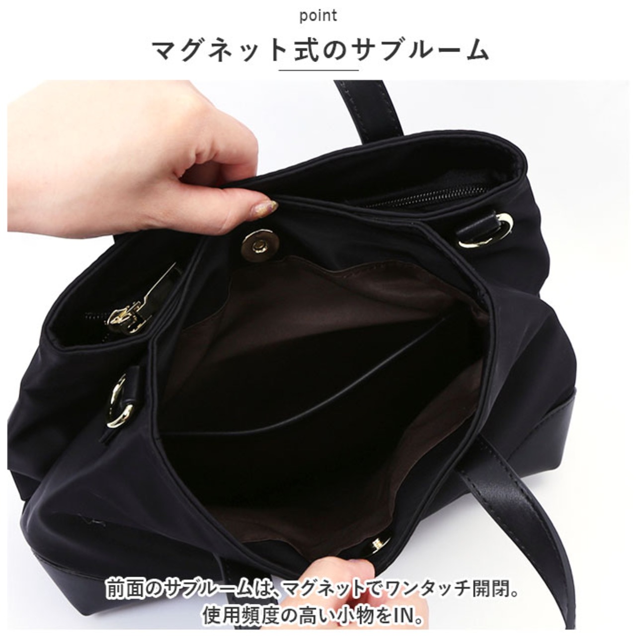 ・前面のサブルームは、マグネットでワンタッチ開閉。使用頻度の高い小物をIN。