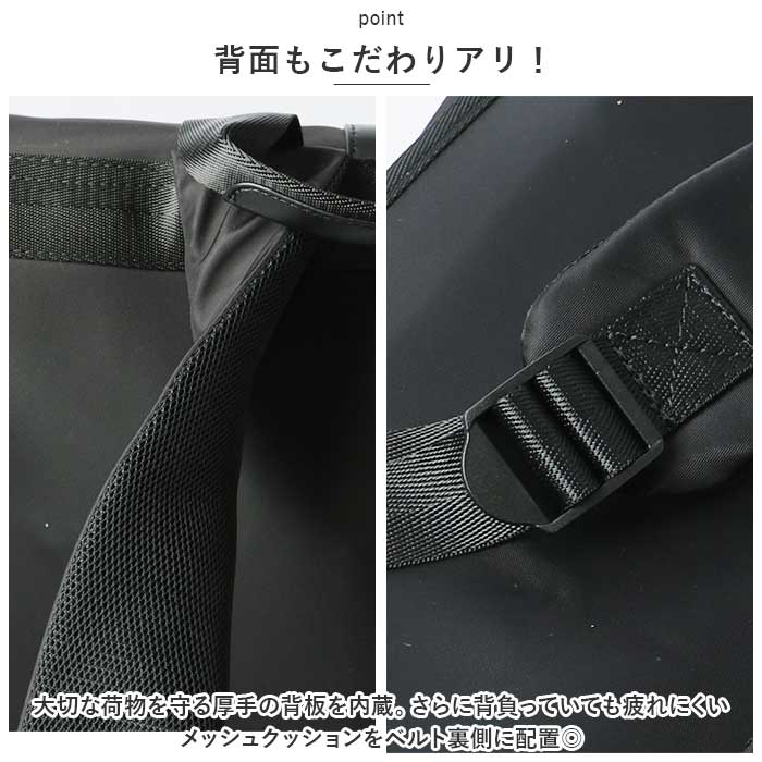・大切な荷物を守る厚手の背板を内蔵。さらに背負っていても疲れにくいメッシュクッションをベルト裏側に配置◎