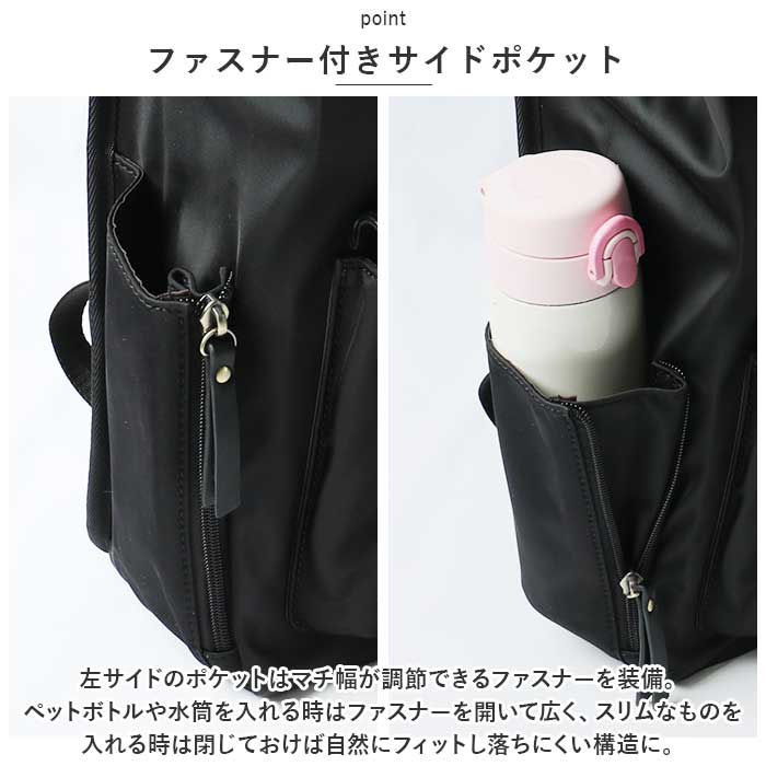 ・左サイドのポケットはマチ幅が調節できるファスナーを装備。ペットボトルや水筒を入れる時はファスナーを開いて広く、スリムなものを入れる時は閉じておけば自然にフィットし落ちにくい構造に。