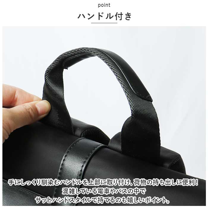 ・手にしっくり馴染むハンドルを上部に取り付け、荷物の持ち出しに便利!混雑している電車やバスの中でサッとハンドスタイルで持てるのも嬉しいポイント。