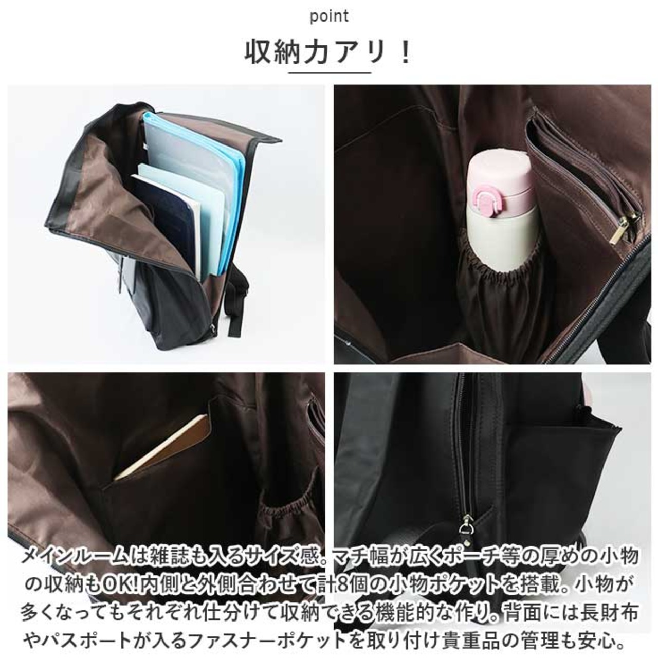 ・内側と外側合わせて計8個の小物ポケットを搭載。小物が多くなってもそれぞれ仕分けて収納できる機能的な作り。
