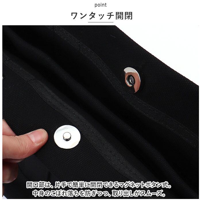 ・開口部は、片手で簡単に開閉できるマグネットボタン式。中身のこぼれ落ちを防ぎつつ、取り出しがスムーズ。