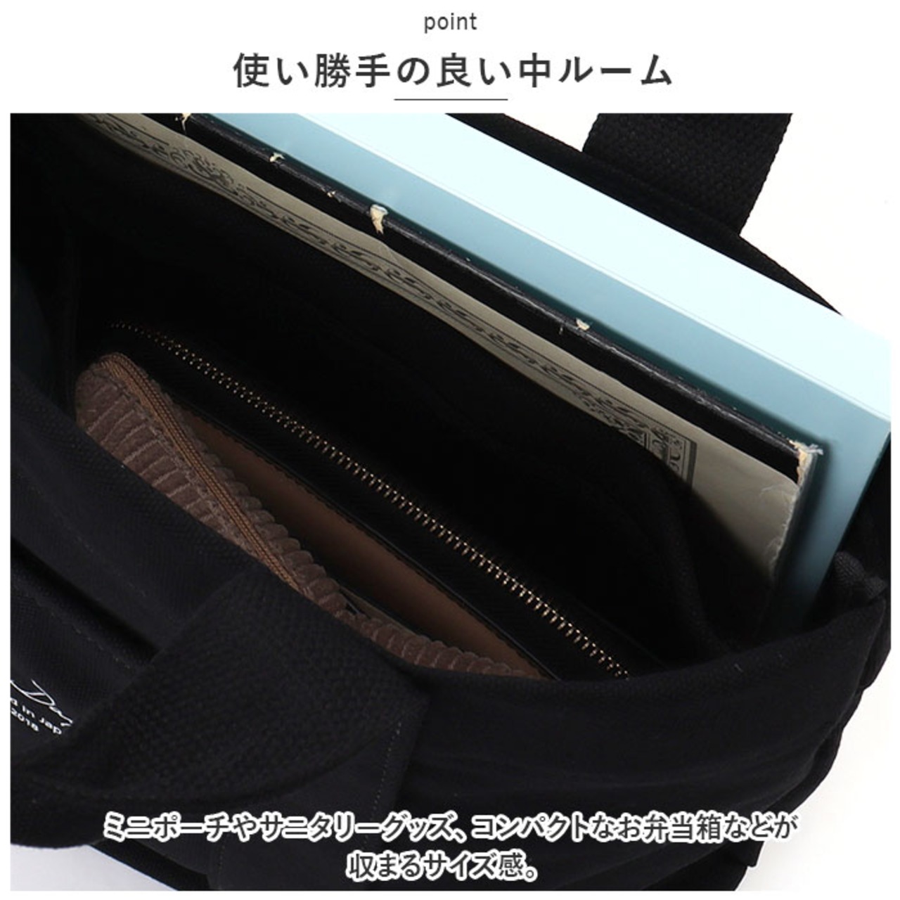 ・ミニポーチやサニタリーグッズ、コンパクトなお弁当箱などが収まるサイズ感。