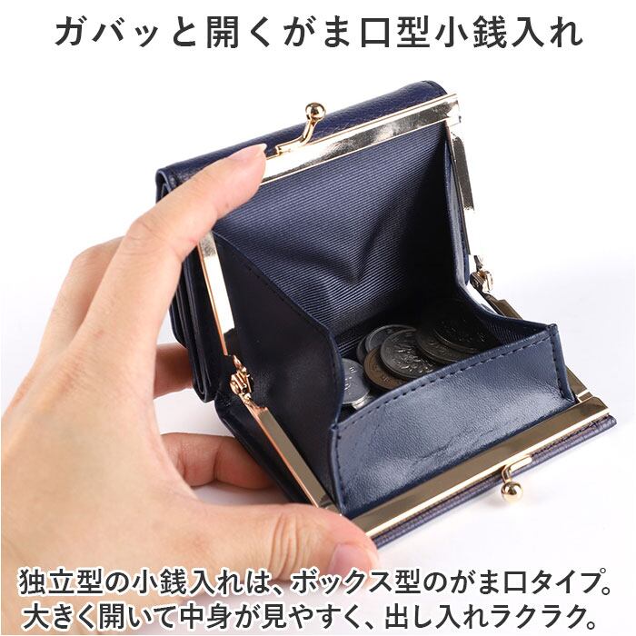 ・独立型の小銭入れは、ボックス型のがま口タイプ。大きく開いて中身が見やすく、出し入れラクラク。