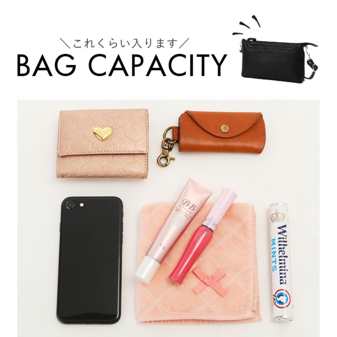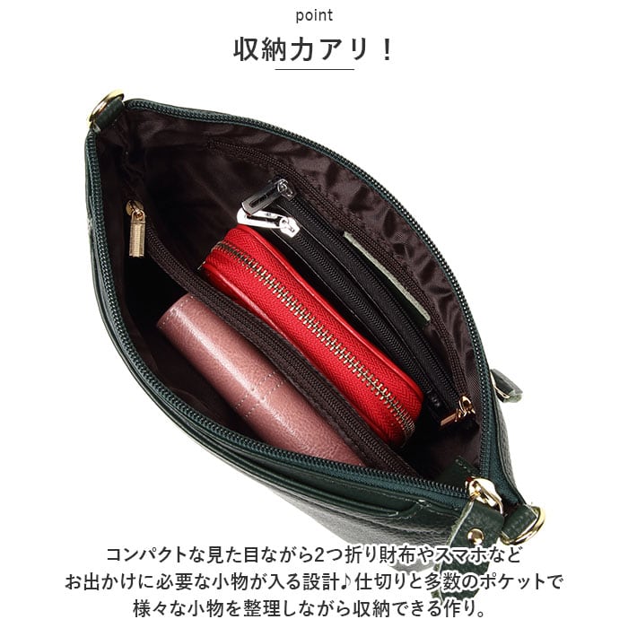 ・コンパクトな見た目ながら2つ折り財布やスマホなどお出かけに必要な小物が入る設計♪