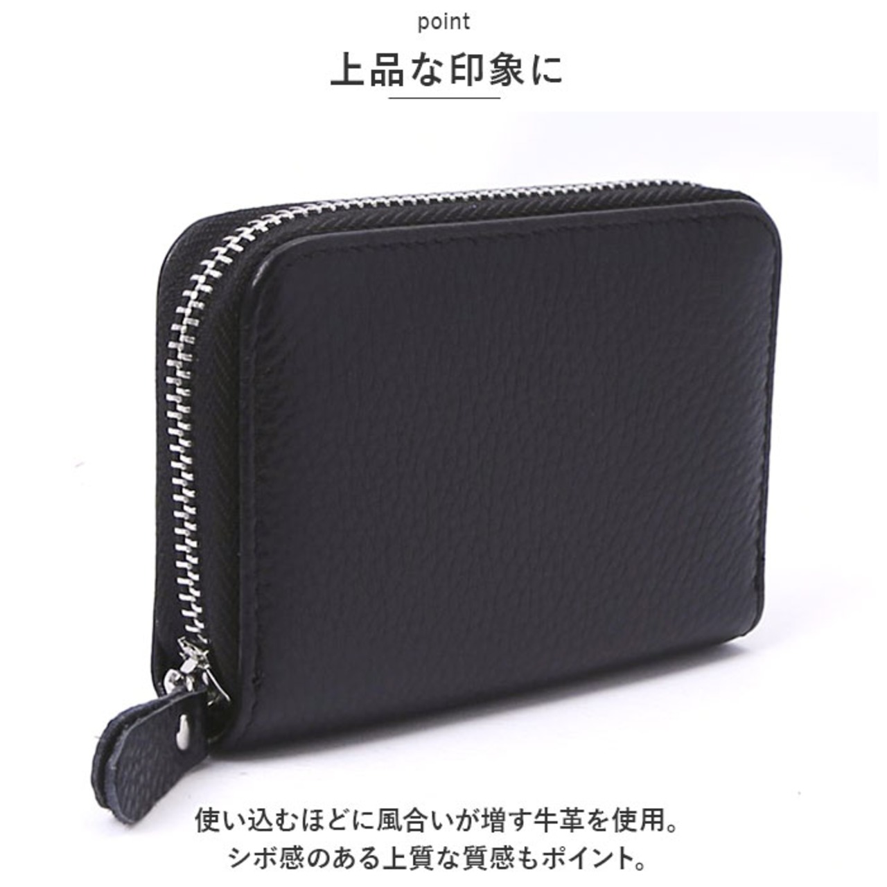 ・使い込むほどに風合いが増す牛革を使用。シボ感のある上質な質感もポイント。