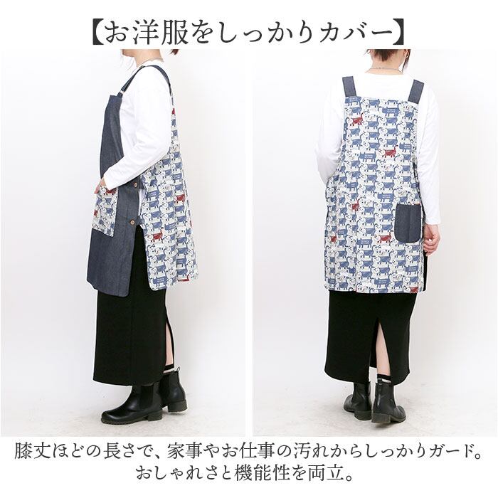 ・膝丈ほどの長さで、家事やお仕事の汚れからしっかりガード。おしゃれさと機能性を両立。