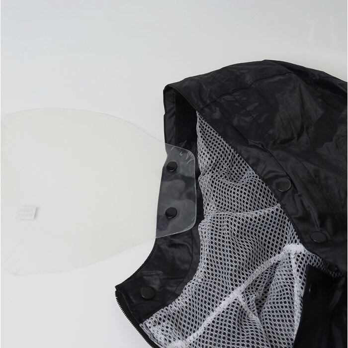 ・フードのツバ部分にはスナップボタン付きの透明窓が付いているので、視界を遮る心配なし!
