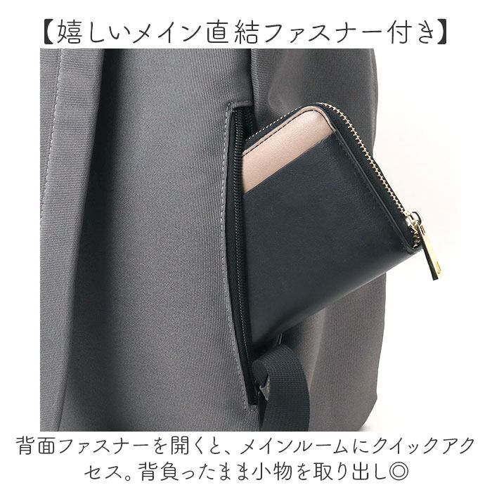 ・背面ファスナーを開くと、メインルームにクイックアクセス。背負ったまま小物を取り出し◎