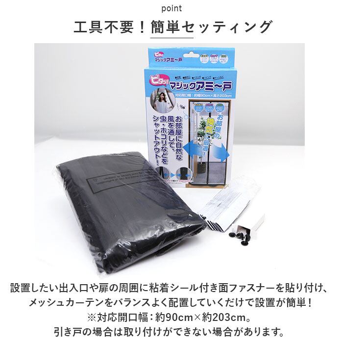 ・設置したい出入口や取らびの周囲に粘着シール付き面ファスナーを貼り付け、メッシュカーテンをバランスよく配置していくだけで設置が簡単!(※対応開口幅:約90cm×約203cm。引き戸の場合は取り付けができない場合があります。)