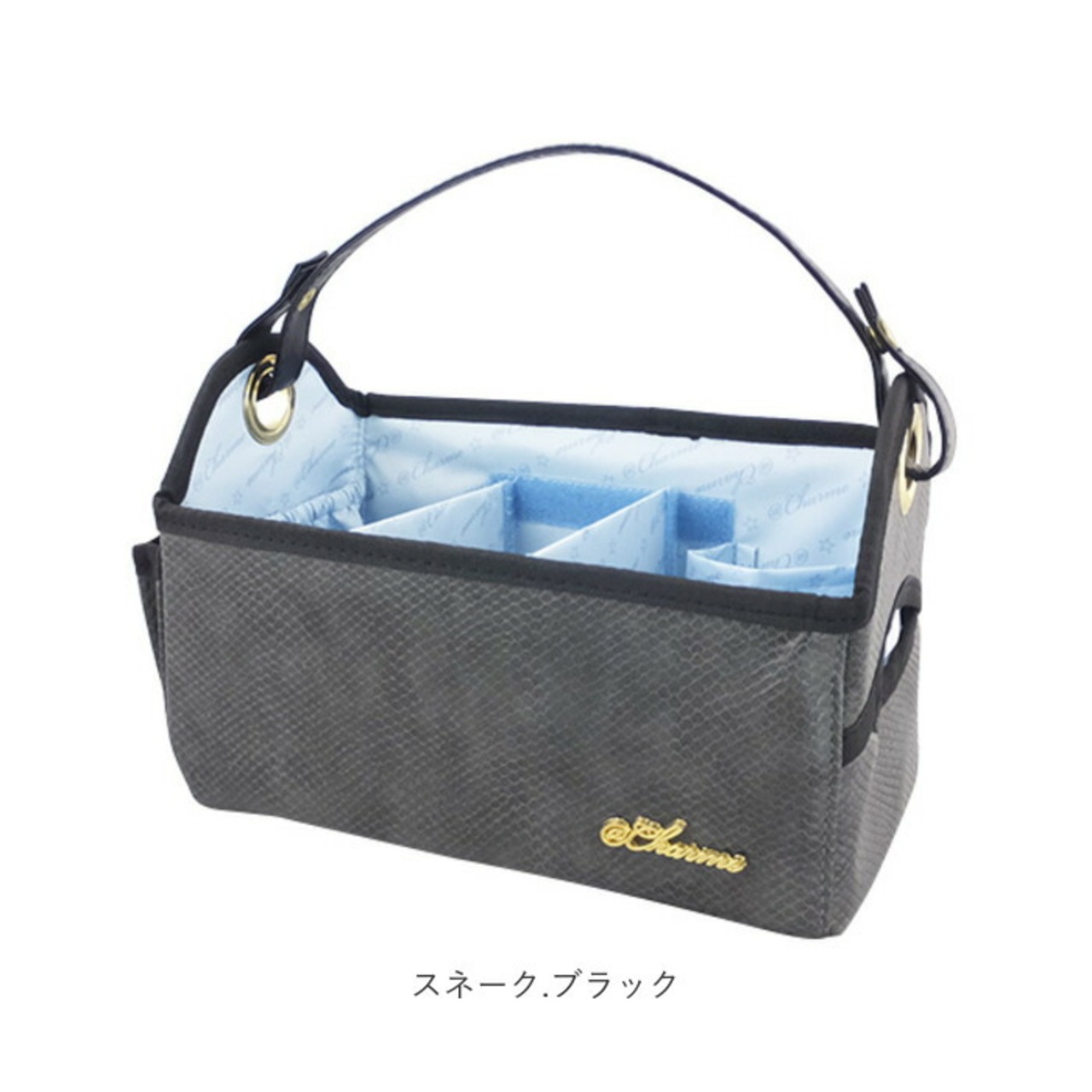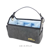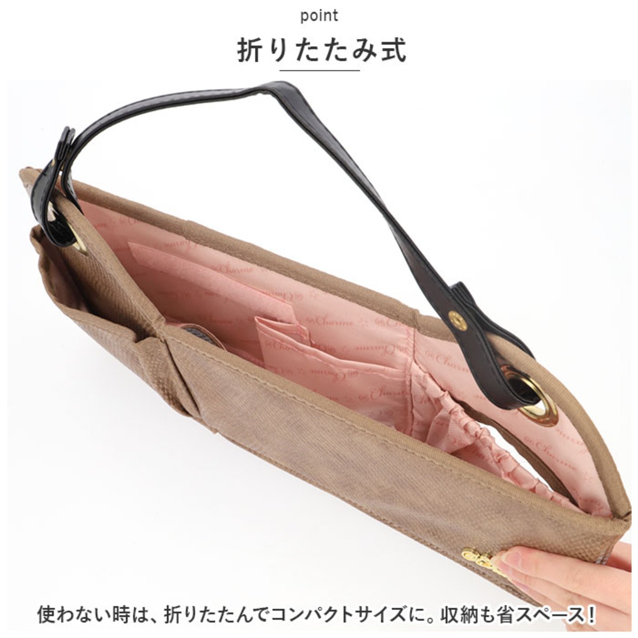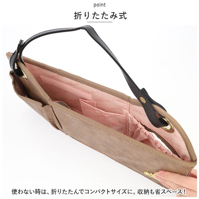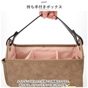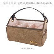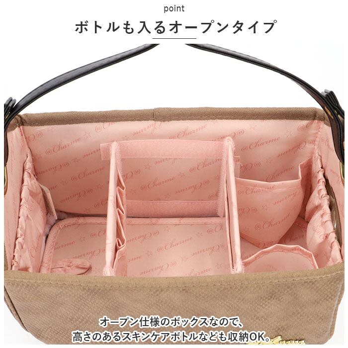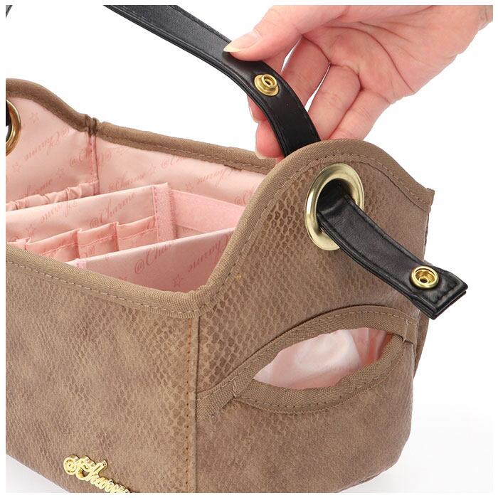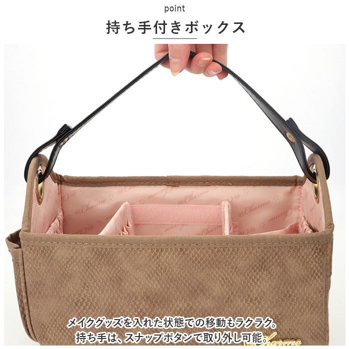 ・メイクグッズを入れた状態での移動もラクラク。持ち手は、スナップボタンで取り外し可能。
