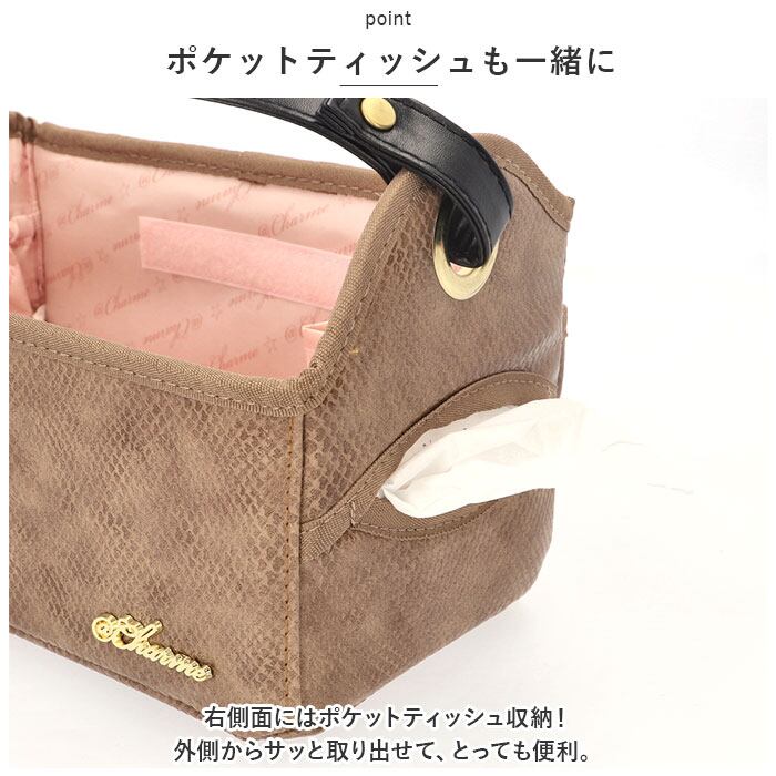 ・右側面にはポケットティッシュ収納!外側からサッと取り出せて、とっても便利。