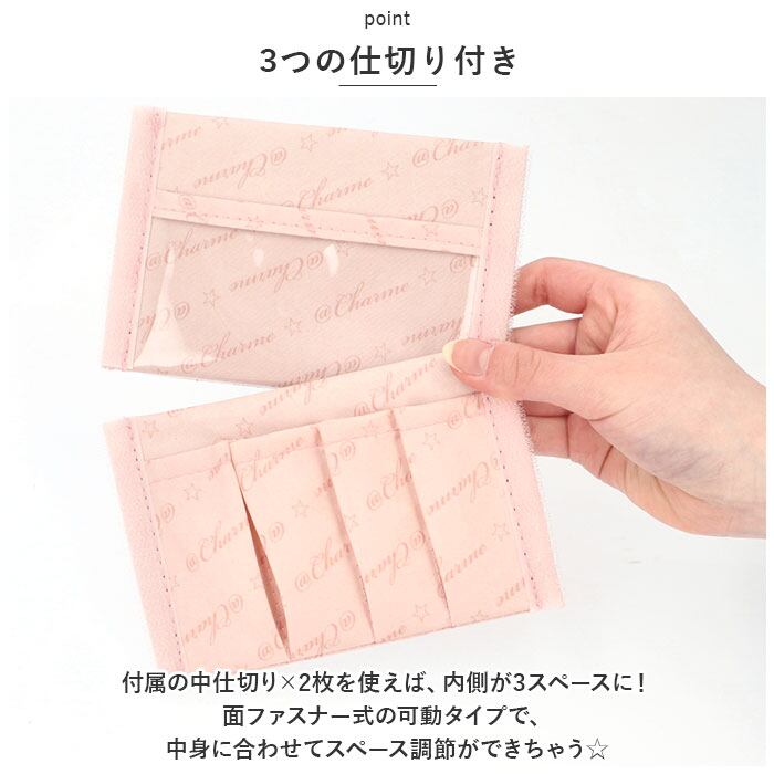 ・付属の中仕切り×2枚を使えば、内側が3スペースに!面ファスナー式の可動タイプで、中身に合わせてスペース調節ができちゃう☆