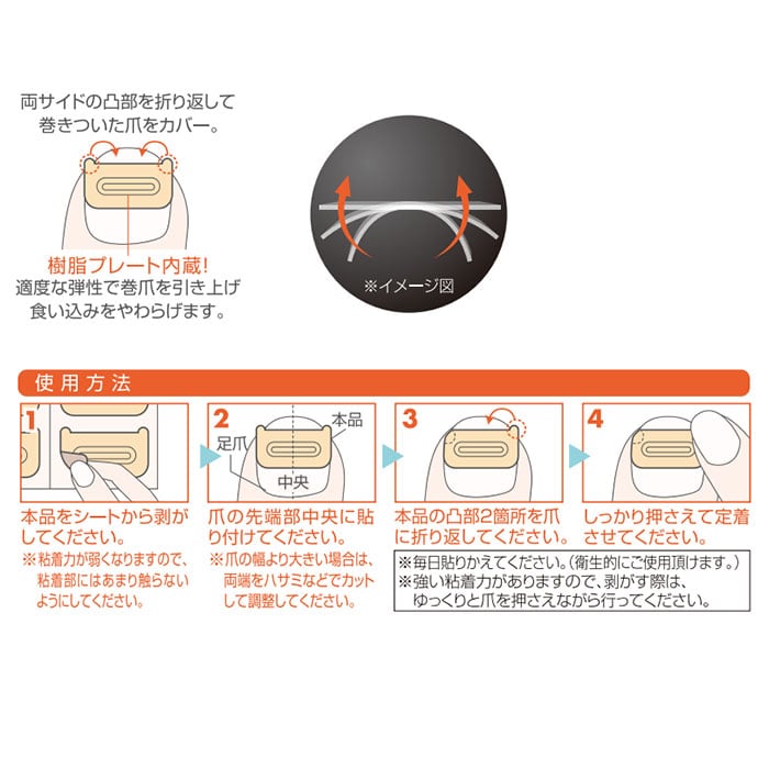 ・内蔵された樹脂プレートの弾性で巻爪を引き上げ、食い込みを和らげる!シール両サイドの凸部を折り返し、巻き付いた爪をカバー。