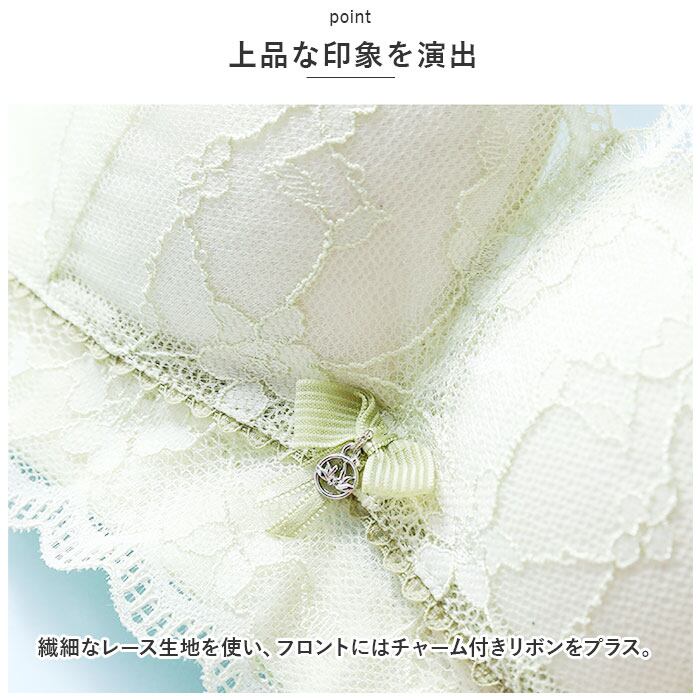・繊細なレース生地を使い、フロントにはチャーム付きリボンをプラス。