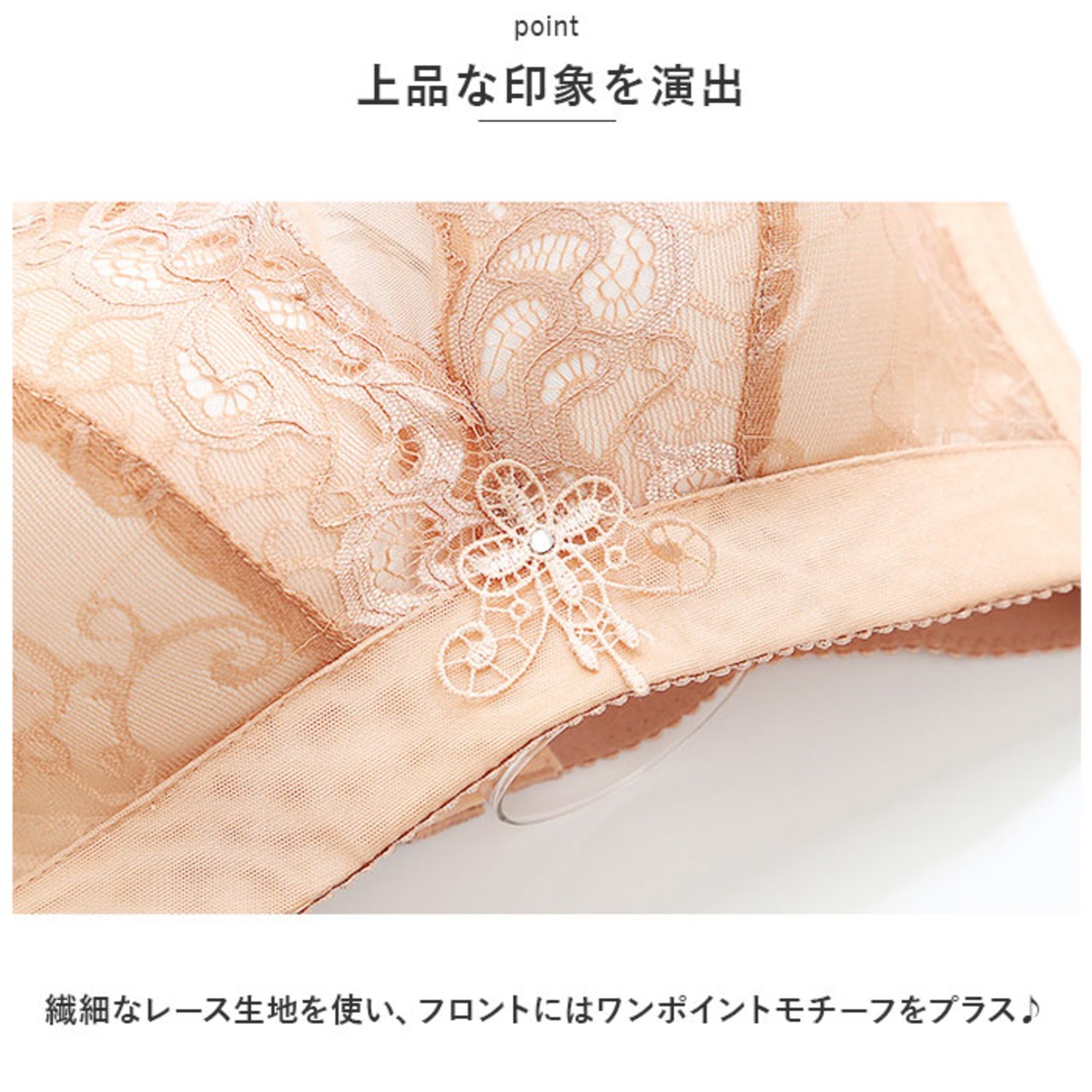 ・繊細なレース生地を使い、フロントにはワンポイントモチーフをプラス♪