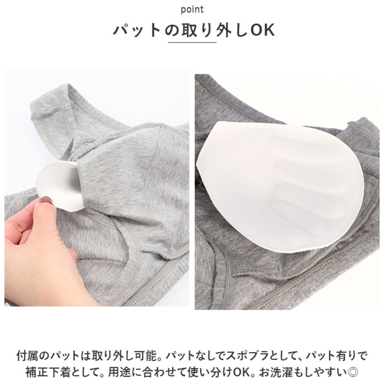 ・付属のパットは取り外し可能。パットなしでスポブラとして、パット有りで補正下着として。用途に合わせて使い分けOK。お洗濯もしやすい◎