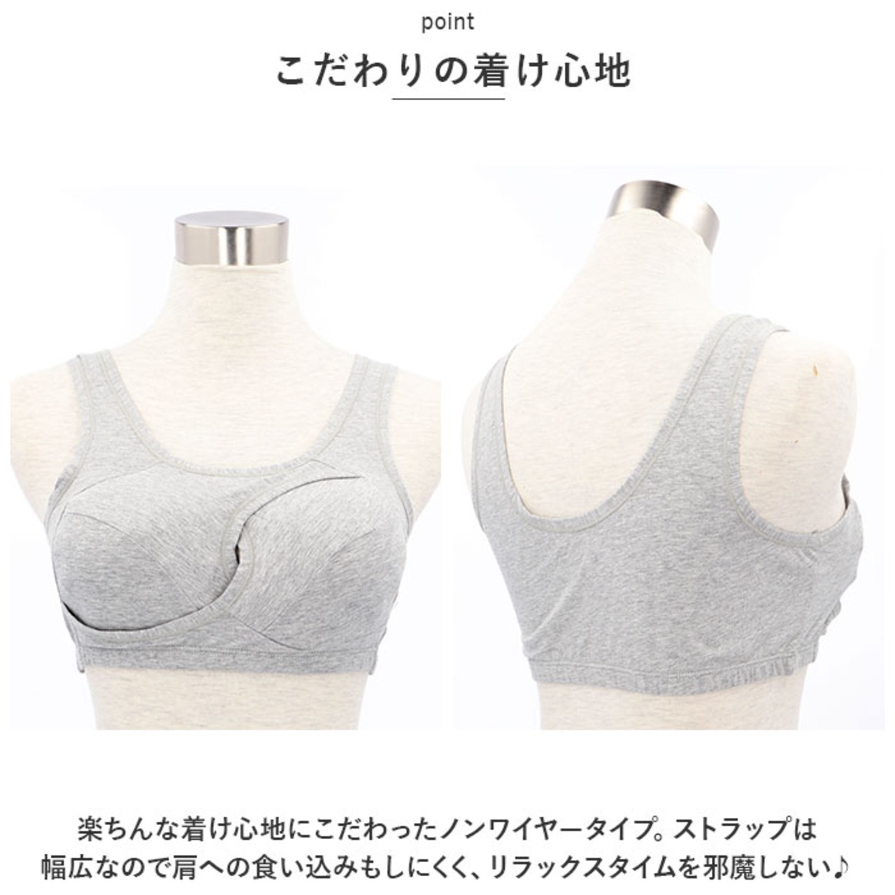 ・楽ちんな着け心地にこだわったノンワイヤータイプ。ストラップは幅広なので肩への食い込みもしにくく、リラックスタイムを邪魔しない♪