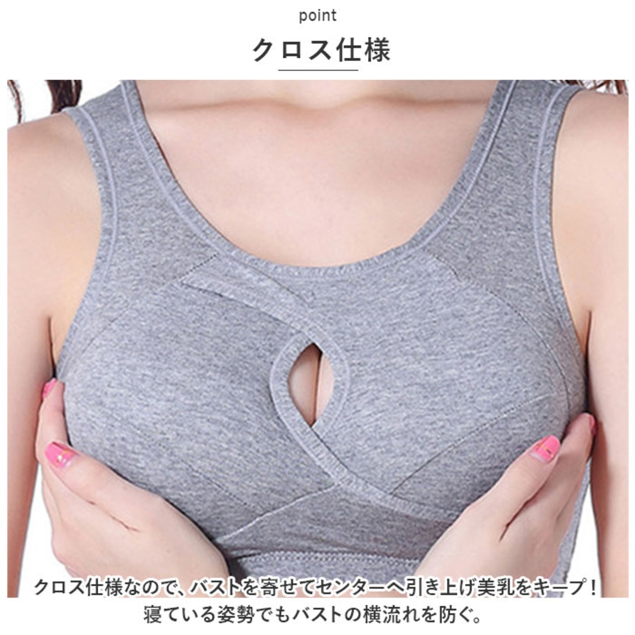 ・クロス仕様なので、バストを寄せてセンターへ引き上げ美乳をキープ!寝ている姿勢でもバストの横流れを防ぐ。