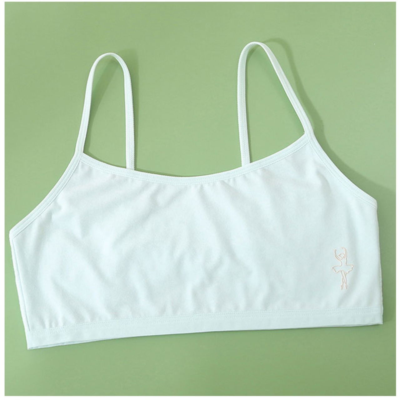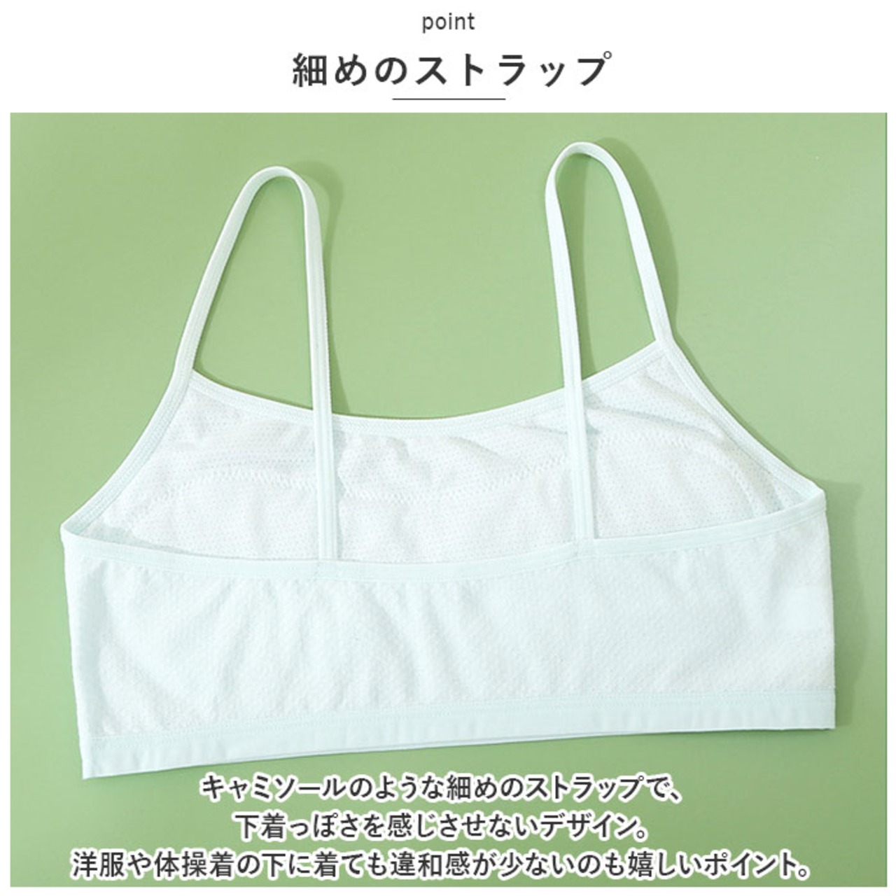 ・キャミソールのような細めのストラップで、下着っぽさを感じさせないデザイン。洋服や体操着の下に着ても違和感が少ないのも嬉しいポイント。