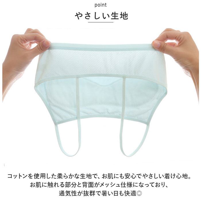 ・コットンを使用した柔らかな生地で、お肌にも安心でやさしい着け心地。お肌に触れる部分と背面がメッシュ仕様になっており、通気性が抜群で暑い日も快適◎