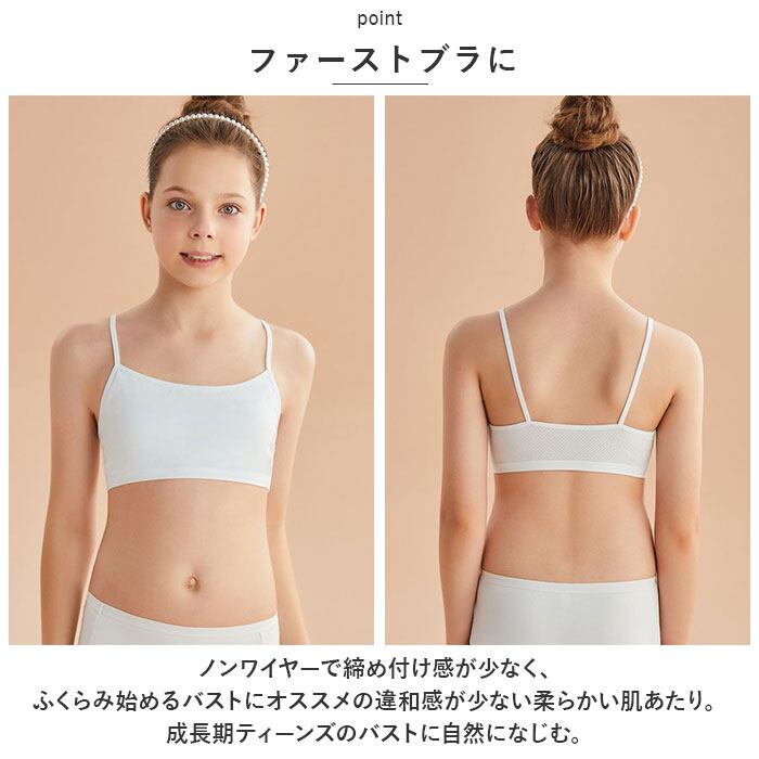 ・ノンワイヤーで締め付け感が少なく、ふくらみ始めるバストにオススメの違和感が少ない柔らかい肌あたり。成長期ティーンズのバストに自然になじむ。